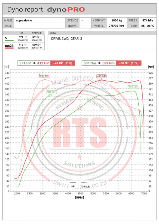 Toyota Supra 3.0 Stage1+ remap, tuning software on 95 pump fuel at altitude 11% more power 18% more torque, end result 250kw-277kw more power and 500-590nm more torque. Safe for 95 pump fuel.