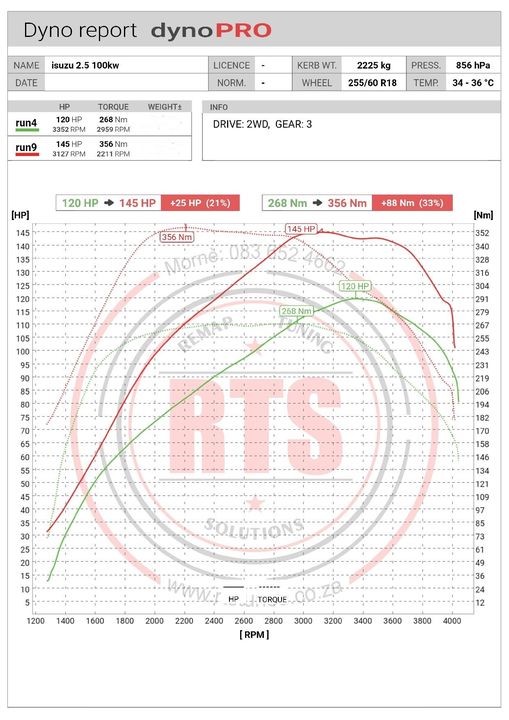 Isuzu 2.5 D-TEQ remap, software chip tuning. 21% more power 33% more torque. End result 100kw-121kw and 320nm-426nm. No clouds of black smoke. Price R2800.